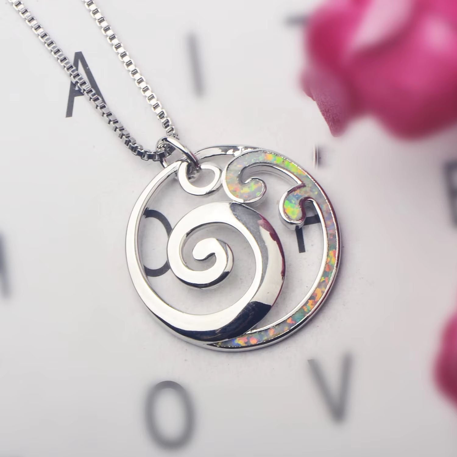 This is a very "New Zealand" piece of jewellery. A koru design is woven into a round pendant embedded with imitation opal. It resembles the crashing waves of the New Zealand coastline.
