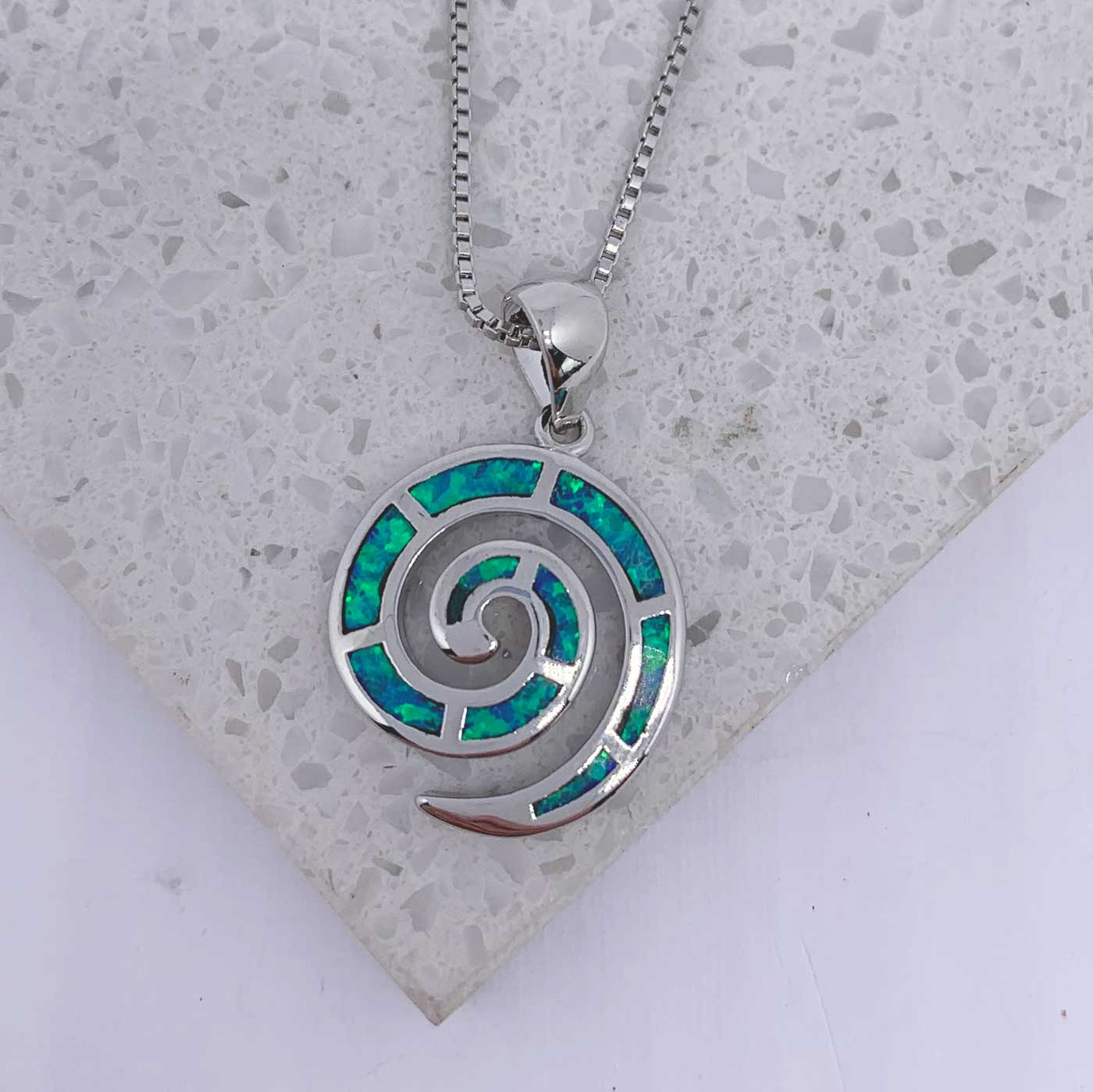 925 Sterling Silver Opal Pendant on a silver box chain. The pendant has a lovely Koru spiral pattern. Ideal as a gift to send overseas.